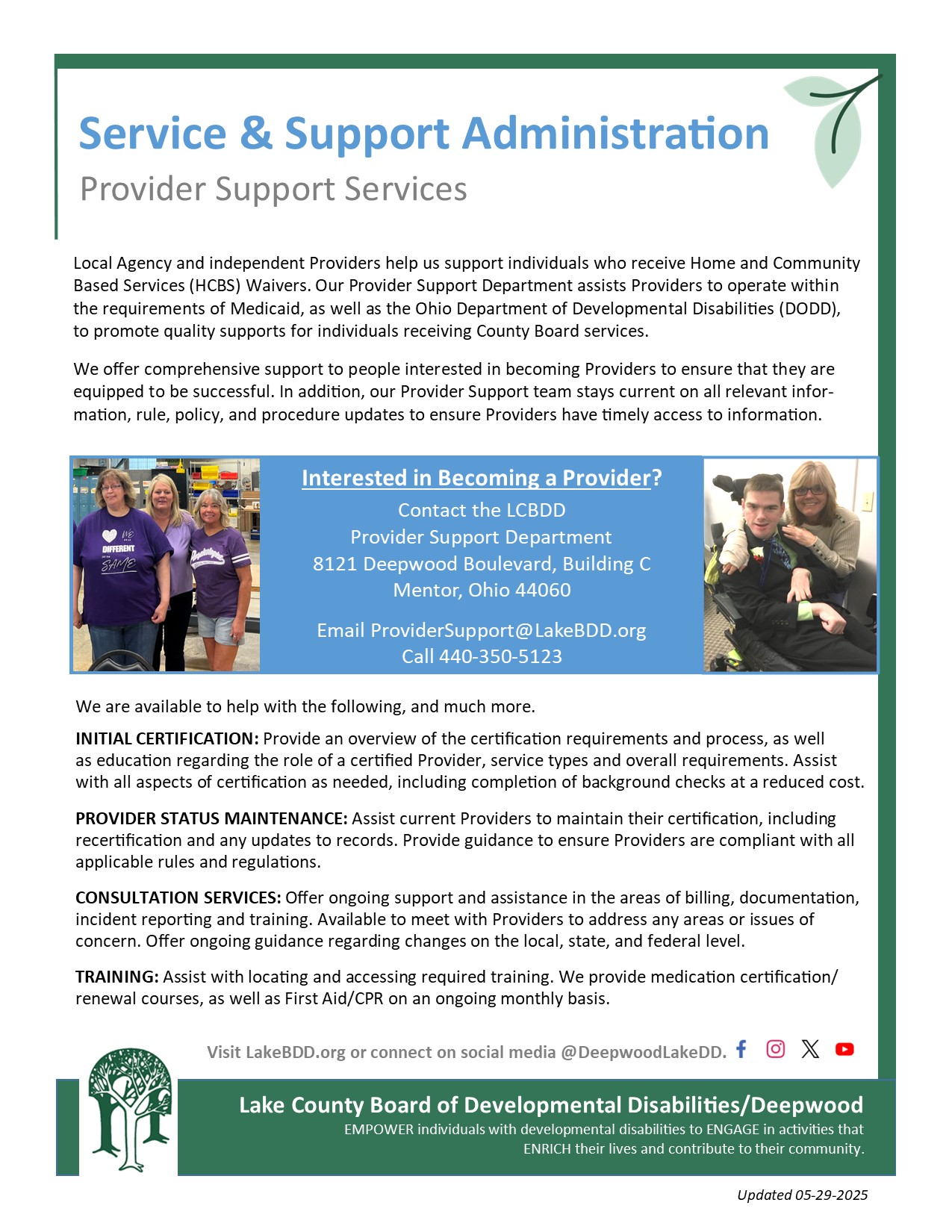 Providers help our County Board support individuals who receive Home and Community Based Services (HCBS) Waivers in Lake County as well as individuals who receive Intermediate Care Facility (ICF) services. Our Provider Support Department assists Agency, Independent, and ICF Providers to operate within the requirements of Medicaid and the Ohio Department of Developmental Disabilities (DODD) to promote quality supports for individuals receiving services.