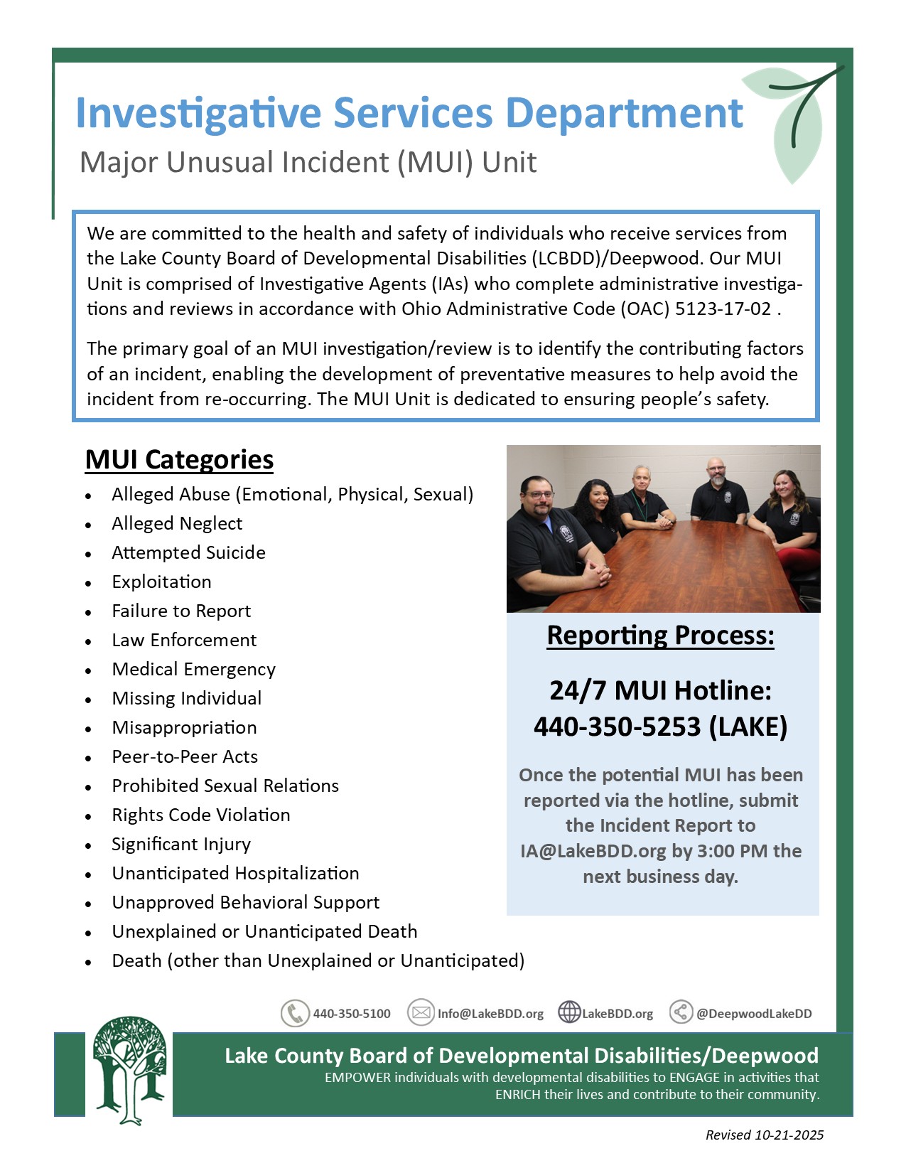 To report an MUI call 440-350-5253. Send incident reports to IA@LakeBDD.org by 3:00 PM the following business day.