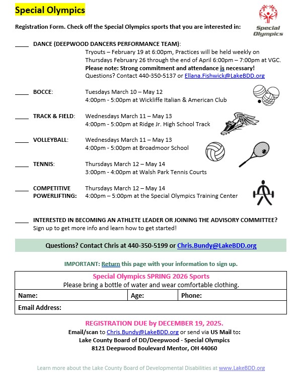 For additional information about Special Olympics Lake County, please call 440-350-5119 or email Chris.Bundy@LakeBDD.org.